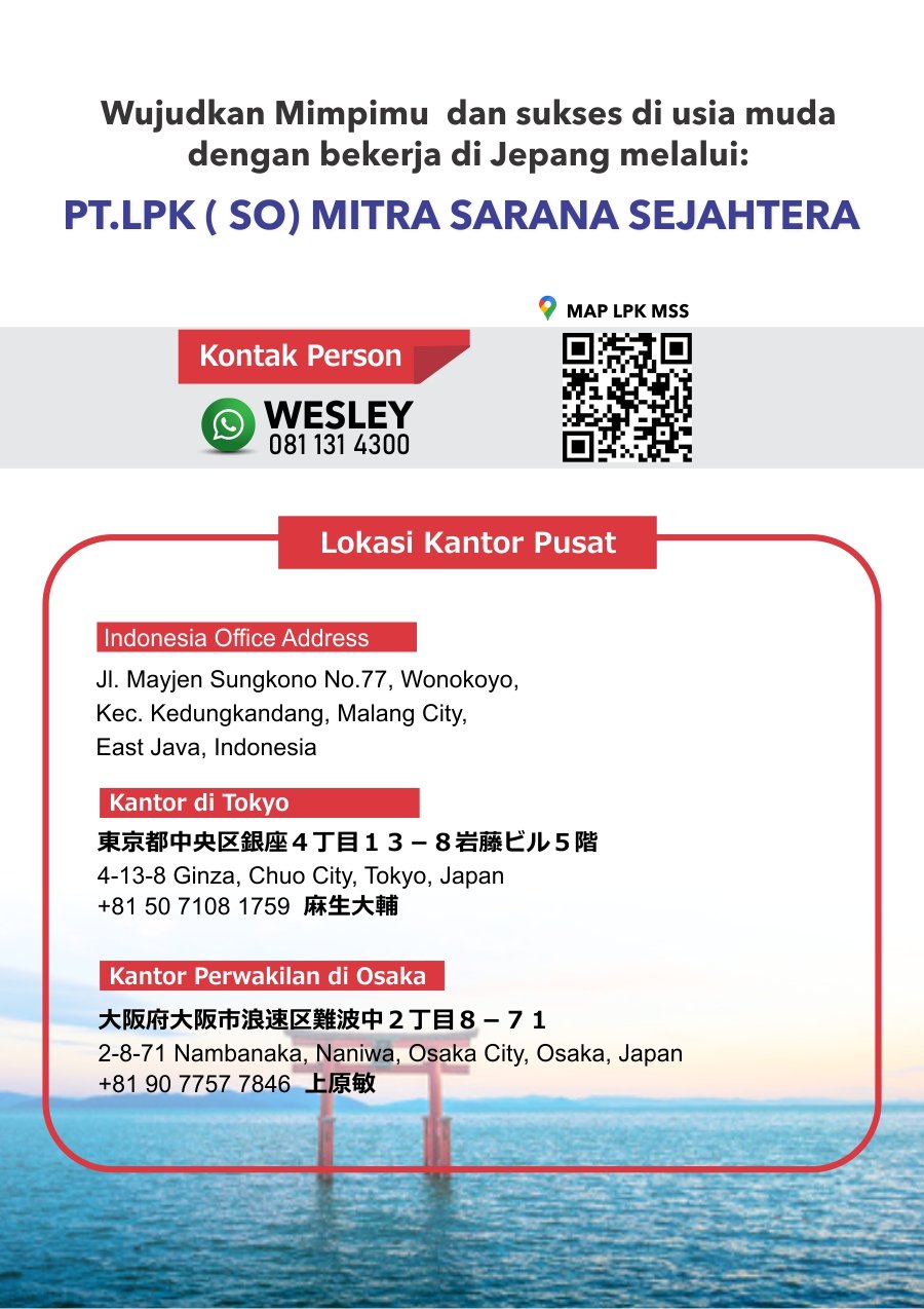 Contact Pendaftaran +62341752266 info@lpkmss.com +62811314300 Contact Kerjasama vnathanael@lpkmss.com +6282230184888 (Victor) vnathanael Follow Us LPK Mitra Sarana Sejahtera mitrasaranasejahtera @lpkmss Lpkmssjepang Address Jl. Mayjen Sungkono No. 77 Wonokoyo, Kedung Kandang, Malang Prov. Jawa Timur Indonesia